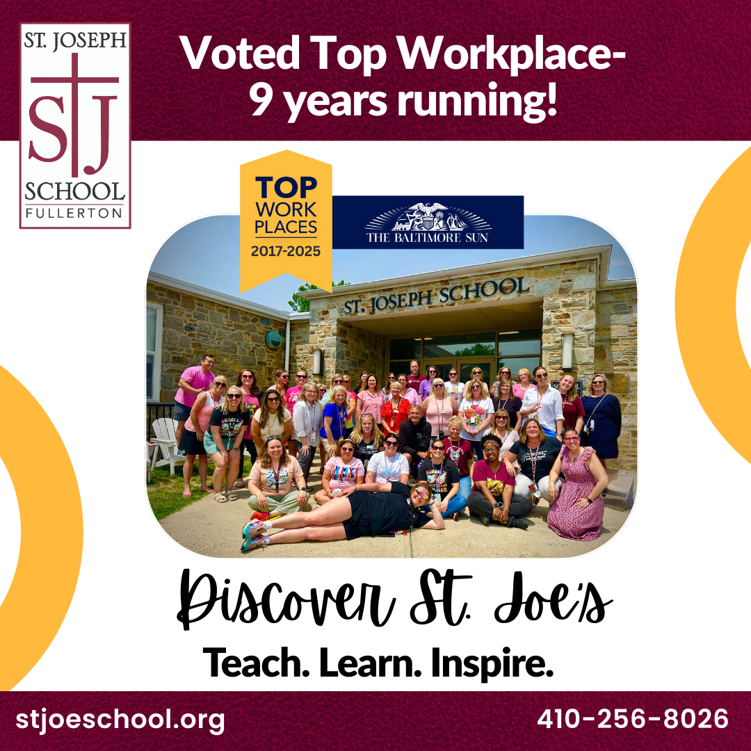 December 3, 2025 - St. Joseph School-Fullerton (SJSF) has been awarded a Top Workplaces 2025 honor by The Baltimore Sun Top Workplaces 2025.