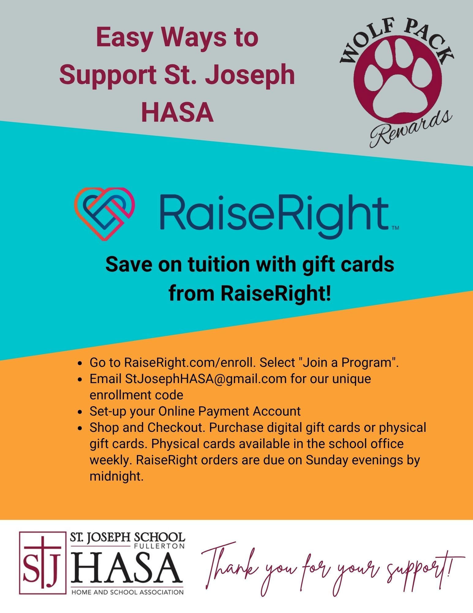 RaiseRight: Buy gift cards through RaiseRight from your favorite brands to use for your daily purchases and save on tuition just by shopping! RaiseRight orders are due on Sunday evenings by midnight. Email stjosephhasa@gmail.com and ask for our enrollment code to sign up. Learn more about the RaiseRight Program By-Laws.