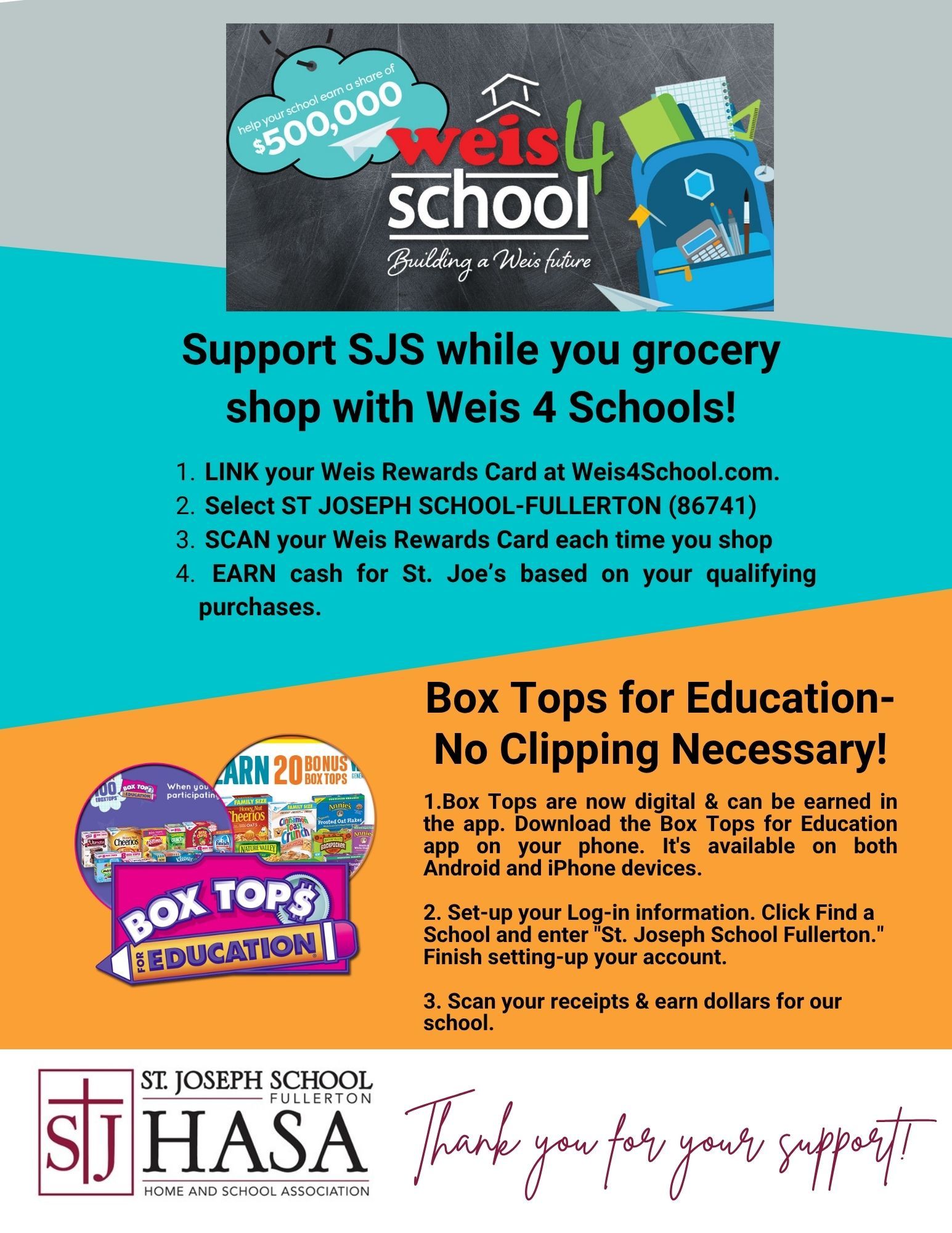 Weis Rewards: Link your Weis Rewards card at Weis4School.com. Select St. Joseph School-Fullerton (86741). Just scan your card each time you shop and earn cash for our school. *Please note that users MUST re-register each school year.